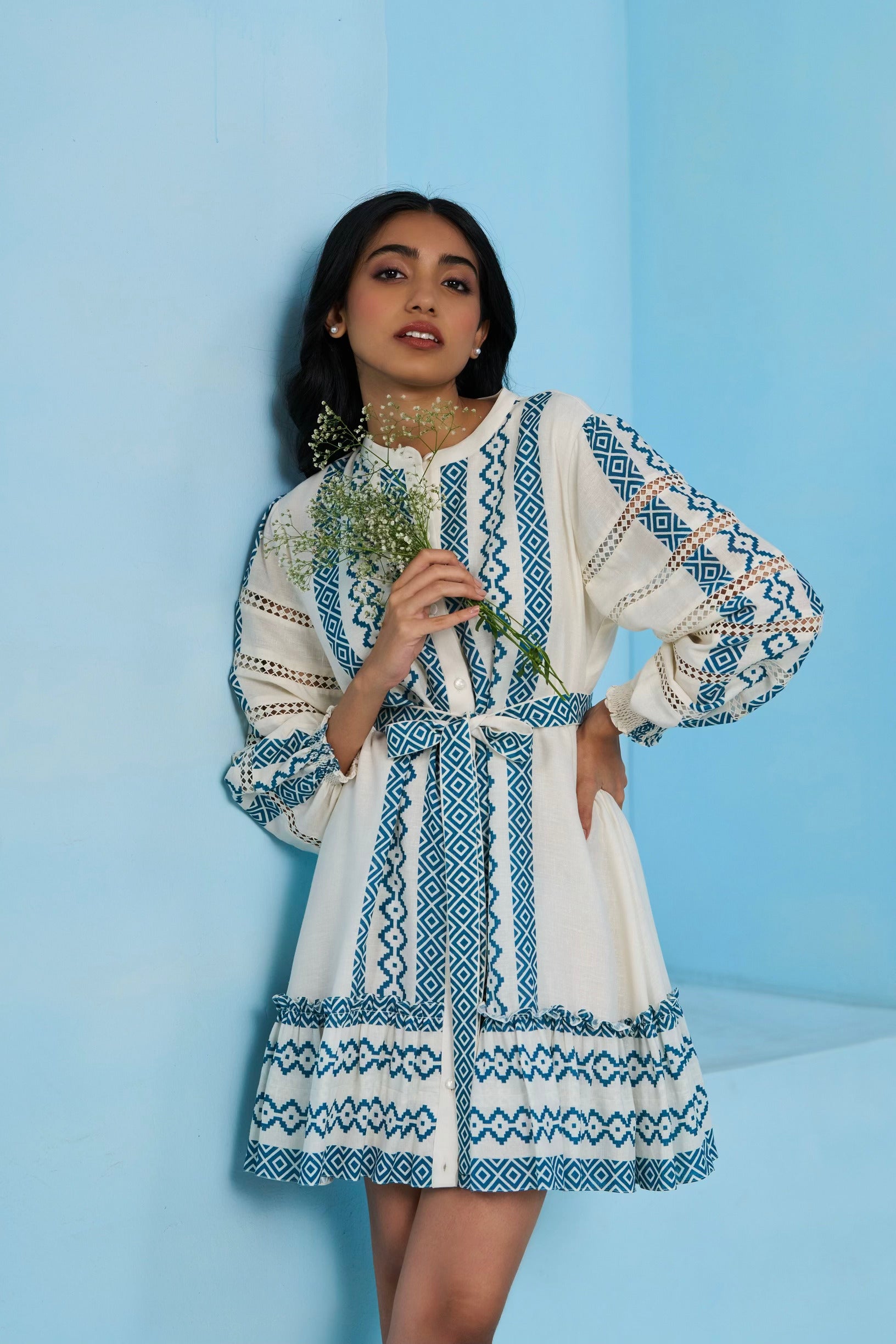 Breeze through the seasons in the Alexis Printed Dress, a stunning fusion of bohemian charm and modern sophistication crafted from ultra-soft linen. This lightweight, button-down mini dress features intricate blue geometric prints and lace detailing on a soft cream base. The belted waist cinches for a flattering silhouette, while delicate crochet trim adds a touch of artisanal craftsmanship. Perfect for sun-drenched escapes or chic city strolls, this versatile piece is your go-to for timeless style with a contemporary edge. Pair it with your favorite sandals for a daytime look or elevate it with heeled boots for an evening out!