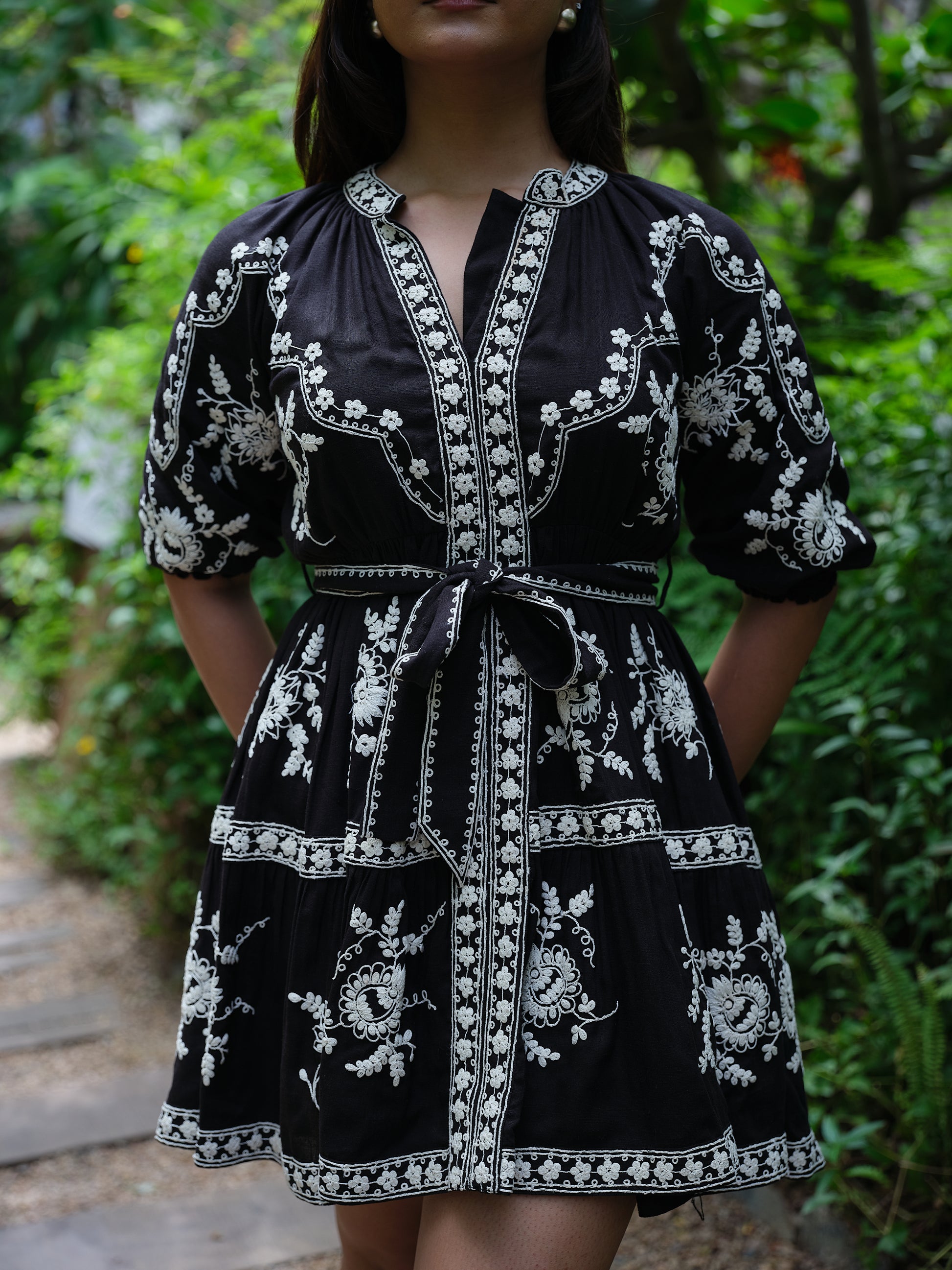 A wardrobe essential with a playful twist, the Dahlia Embroidered Dress features delicate off white embroidery on bold black. The V-neckline elongates the frame, while soft puff sleeves lend a graceful, modern edge to this timeless mini crafted in breathable, high-quality linen. The design allows for versatile styling – dress it up for formal occasions or embrace a casual chic look with ease.