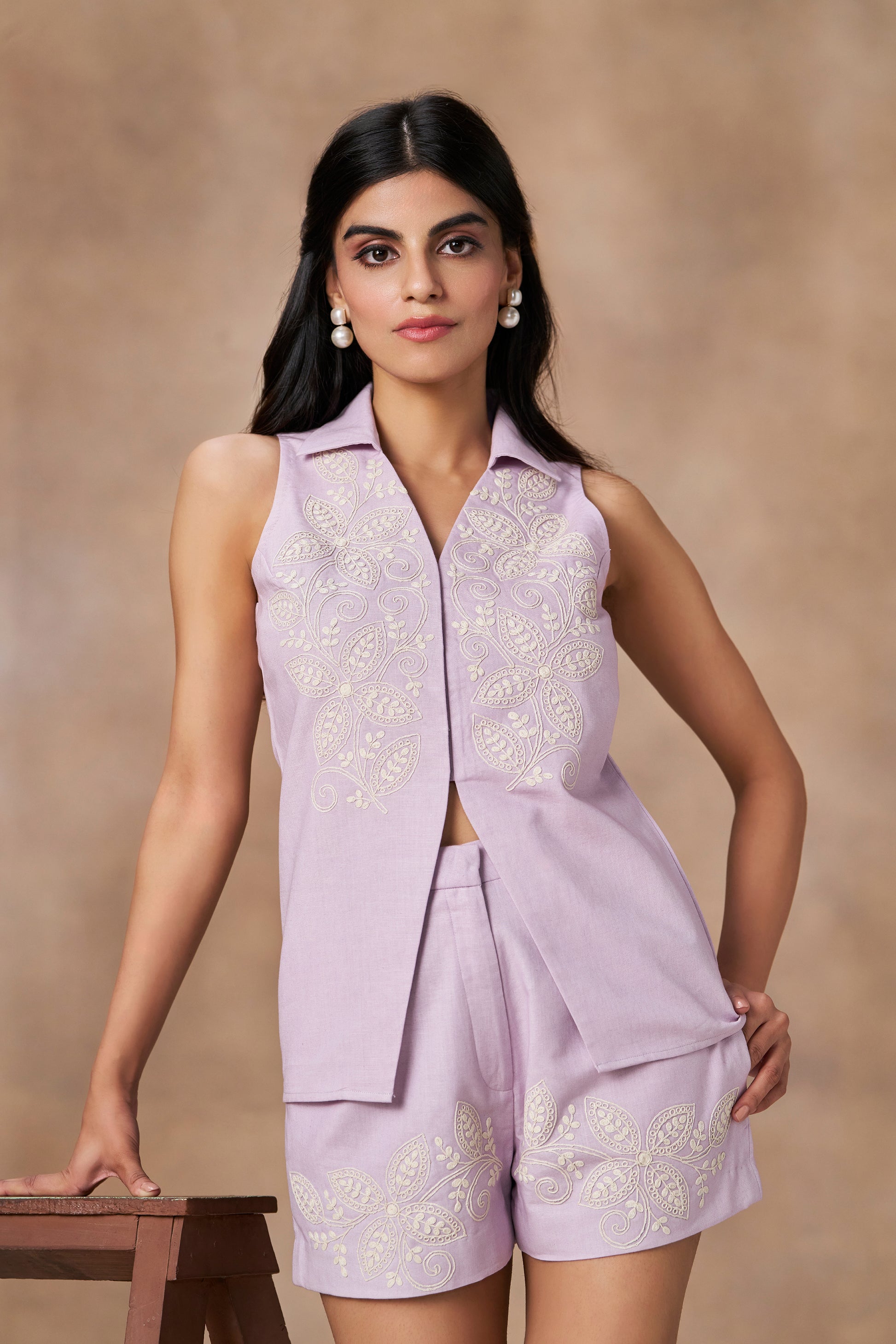 Paired with high-waisted shorts adorned with matching embroidery along the hem, Quinn balances sophistication with relaxed charm. Available in two versatile hues — Beige and Lilac — this co-ord transitions seamlessly from resort mornings to city afternoons with effortless poise.