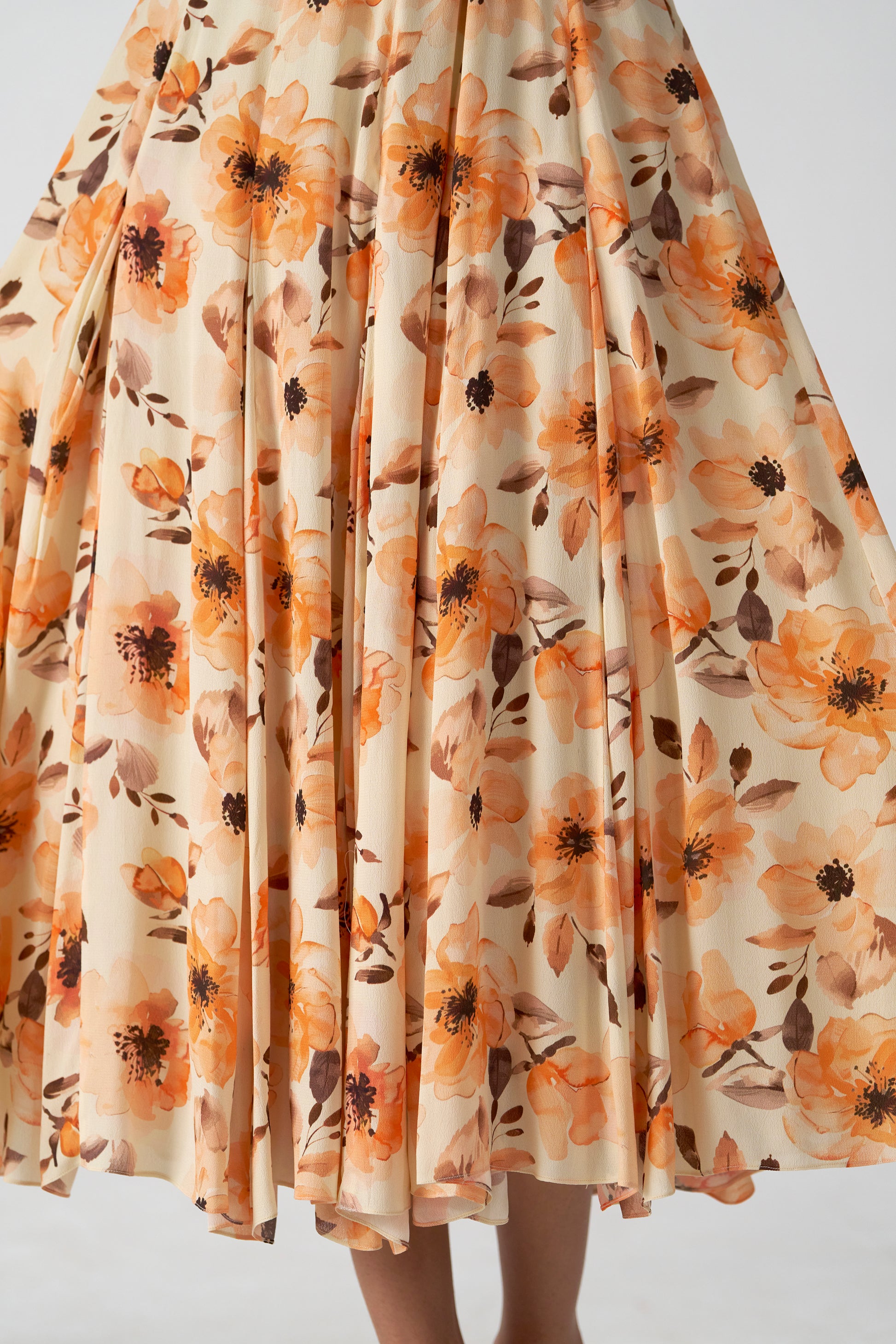 Bask in the charm of effortless elegance with our Scarlet Printed Dress. Crafted from lightweight viscose crepe, this midi dress features a warm cream base adorned with vivid orange and earthy floral prints that radiate summer romance. The delicate spaghetti straps and box pleats create a graceful silhouette that moves beautifully with every step. Perfect for brunches, garden parties, or a sunlit stroll, this dress pairs seamlessly with strappy heels or flats for a chic, feminine look.