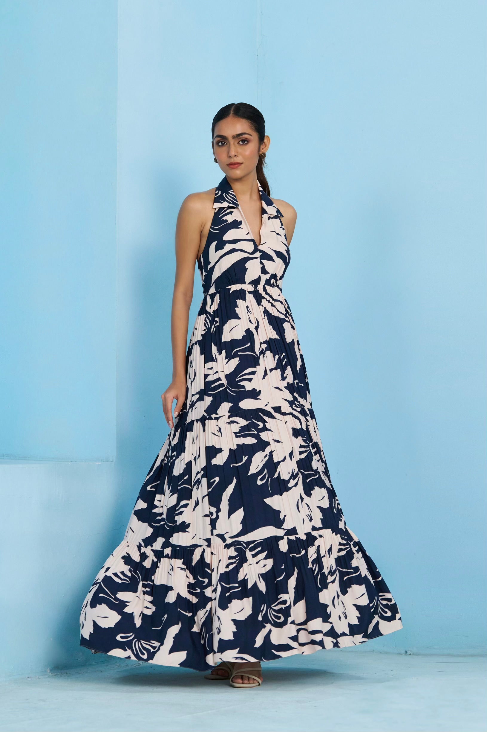 Elegance meets ease in our Willow Maxi Dress, crafted in lustrous modal Satin for a soft, breathable feel and a subtle sheen. Featuring a striking hand-drawn floral pattern in soft blush against a rich navy base, this tiered maxi silhouette flows beautifully with every step. The halter neckline with a twist-front detail adds a touch of sophistication, while the defined waist and tiered skirt lend a flattering shape. Ideal for resort getaways, summer days, or effortless everyday glamour.